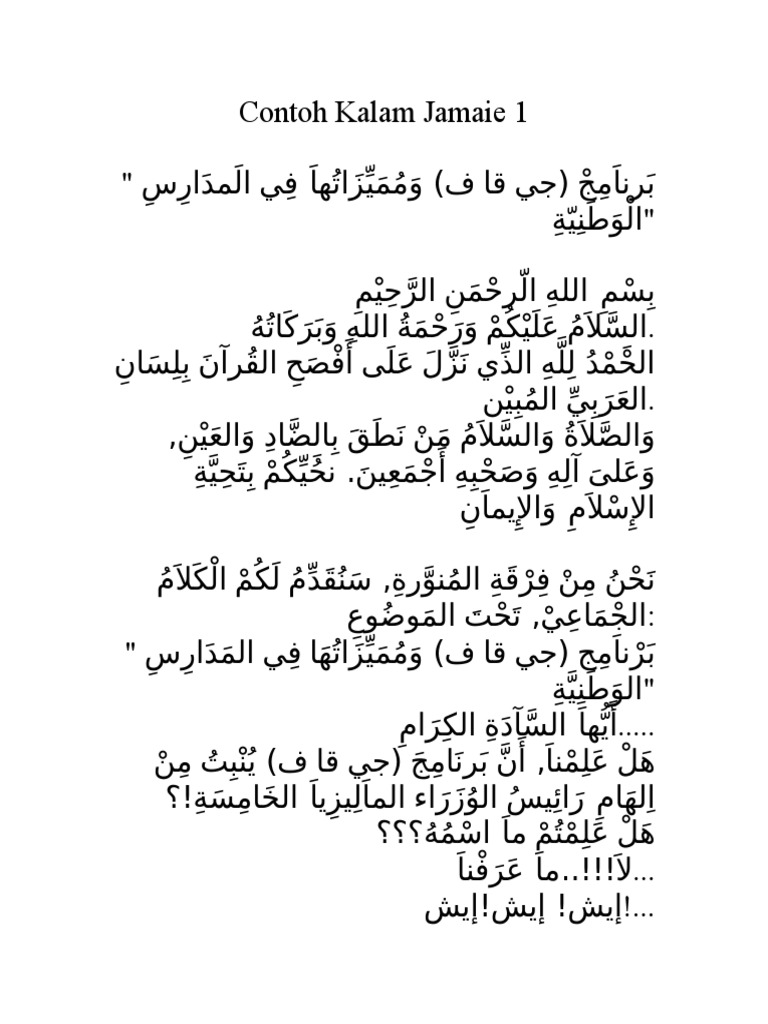 CONTOH TEKS KALAM JAMAIE BAHASA ARAB كلام جماعي اللغة العربية. Makluman kepada semua guru Bahasa Arab Sekolah Kebangsaan yang mengajar Bahasa Arab Tahun 4 5 dan 6 soalan Penilaian Kendalian Sekolah Rendah PKSR bagi bulan Oktober 2011 telah tersedia dan boleh dimuat turun melalui laman web Bahagian Perkembangan Kurikulum BPK Kementerian Pelajaran Malaysia dengan menggunakan kata laluan yang. Latihan Pasukan Kalam Jamie Sautul Jamilah akan diadakan bermula pada 10 Mei 2013 ini.